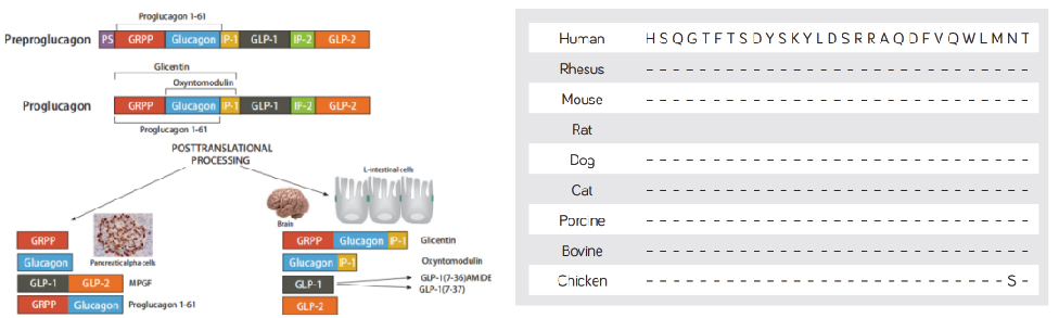 ①氨基酸少,并且衍生物同源性極高【胰高血糖素(1-29)是通過用激素原轉(zhuǎn)化酶2處理胰高血糖素原產(chǎn)生的 ,分子量為3485Da ;胰高血糖素樣肽-1(GLP-1),胰高血糖素樣肽-2(GLP-2),腸高血糖素和胃泌酸調(diào)節(jié)素來源于激素原轉(zhuǎn)化酶1處理的胰高血糖素原】 。