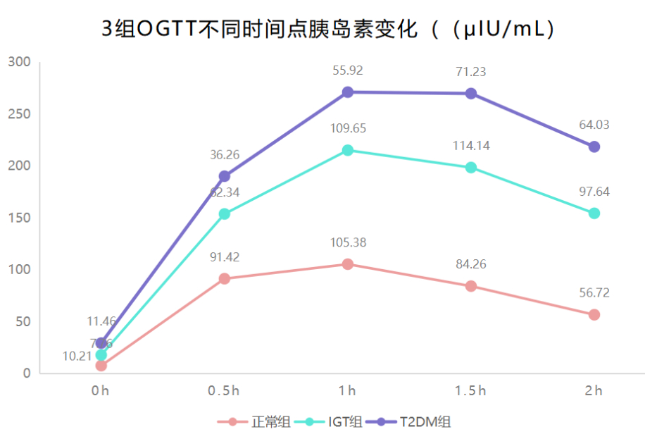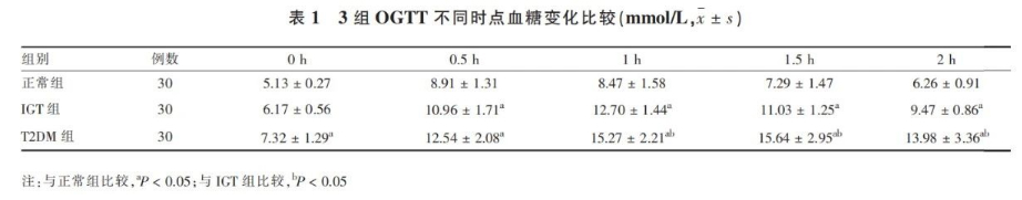T2DM組在各時(shí)點(diǎn)平均血糖均高于正常組,在1h、1.5h和2h的平均血糖均高于IGT組,IGT組在0.5h、1h、1.5h和2h的平均血糖均高于正常組,差異均有統(tǒng)計(jì)學(xué)意義(P<0.05)。