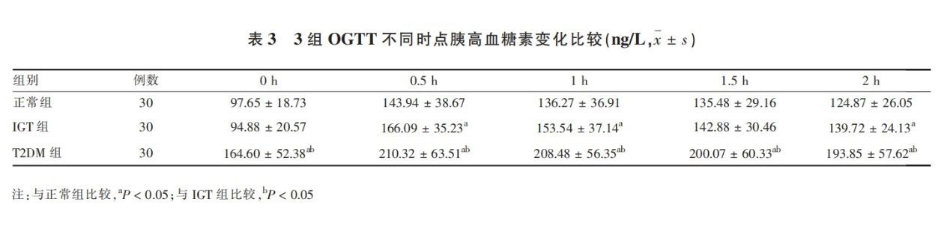 2、3組OGTT不同時(shí)點(diǎn)胰島素變化如表2、圖2所示