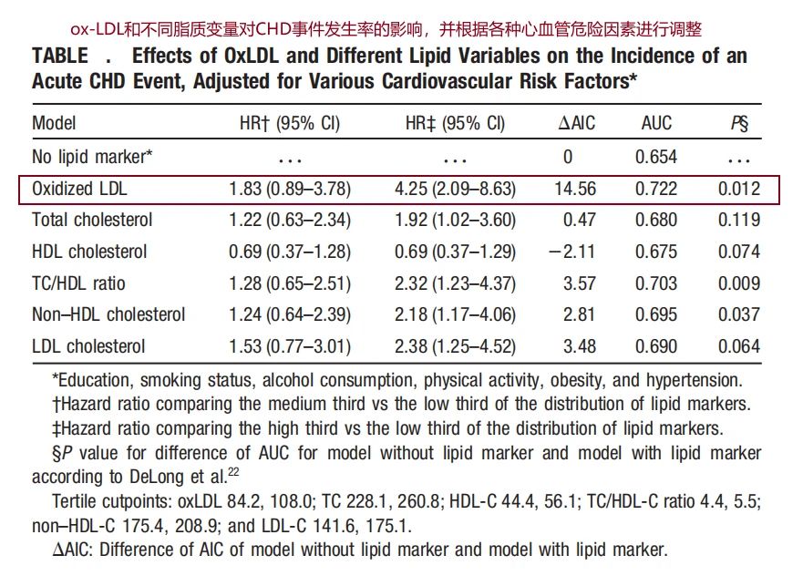 血漿中的循環(huán)ox-LDL是識(shí)別冠心病風(fēng)險(xiǎn)的一個(gè)有用的標(biāo)志物。在同一模型中同時(shí)評(píng)估ox-LDL時(shí),即使在調(diào)整了所有傳統(tǒng)心血管風(fēng)險(xiǎn)因素和TC/HDL-C比值(傳統(tǒng)血脂變量中最有力的風(fēng)險(xiǎn)預(yù)測(cè)因素之一)后,ox-LDL仍能預(yù)測(cè)未來(lái)的冠心病事件。